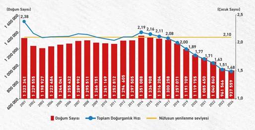Toplam doğurganlık hızı, bir kadının doğurgan kabul edilen yaş aralığında (15-49 yaş) sahip olabileceği ortalama canlı doğum sayısını ifade eden temel demografik göstergelerden biridir. Türkiye’de toplam doğurganlık hızı, 2001 yılında ortalama 2,38 çocuk seviyesinde iken, ilerleyen yıllarda genel olarak dalgalı bir seyir izlemiş; 2014 yılından itibaren ise belirgin ve sürekli bir düşüş eğilimine girmiştir. Bu doğrultuda, 2024 yılı itibarıyla toplam doğurganlık hızı 1,48’e gerilemiş; böylece nüfusun kendini yenileme eşiği olarak kabul edilen 2,10 seviyesinin oldukça altında kalmıştır. Söz konusu bu eğilim, sadece geçici bir durumu değil, aynı zamanda Türkiye’nin doğurganlık örüntüsünde yapısal bir dönüşümün işaretlerini taşımaktadır. Nitekim 2016 yılından bu yana doğurganlık hızı, nüfus yenilenme düzeyinin altında seyretmektedir.