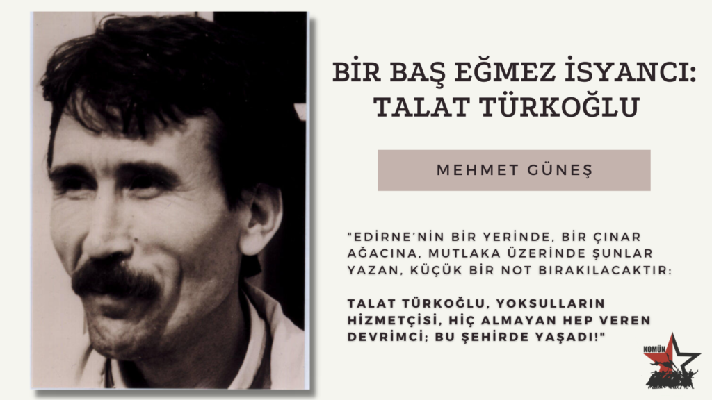 Trakyalılar, Talat’ı ve diğer onlarca Trakyalı katledilmiş devrimciyi unutmayacak. Er veya geç Edirne’nin en merkezi yerine bir anıt dikilecektir. Bunu halk yapacaktır. Talat bunları duysa mutlaka, “heykel meykelle ne işim olur, kesinlikle istemiyorum” der, isyan ederdi. Ancak Edirne’nin bir yerinde, bir çınar ağacına, mutlaka üzerinde şunlar yazan, küçük bir not bırakılacaktır: Talat Türkoğlu, yoksulların hizmetçisi, hiç almayan hep veren devrimci; bu şehirde yaşadı!
