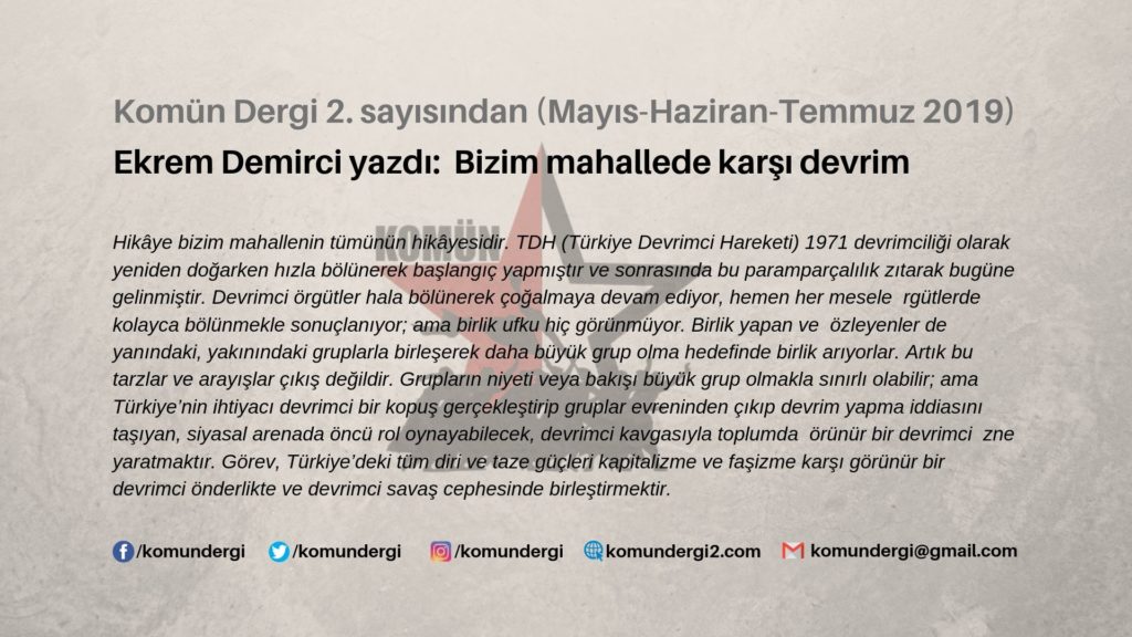 Hikâye bizim mahallenin tümünün hikâyesidir. TDH (Türkiye Devrimci Hareketi) 1971 devrimciliği olarak yeniden doğarken hızla bölünerek başlangıç yapmıştır ve sonrasında bu paramparçalılık azıtarak bugüne gelinmiştir. Devrimci örgütler hala bölünerek çoğalmaya devam ediyor, hemen her mesele örgütlerde kolayca bölünmekle sonuçlanıyor; ama birlik ufku hiç görünmüyor. Birlik yapan ve gözleyenler de yanındaki, yakınındaki gruplarla birleşerek daha büyük grup olma hedefinde birlik arıyorlar. Artık bu tarzlar ve arayışlar çıkış değildir. Grupların niyeti veya bakışı büyük grup olmakla sınırlı olabilir; ama Türkiye’nin ihtiyacı devrimci bir kopuş gerçekleştirip gruplar evreninden çıkıp devrim yapma iddiasını taşıyan, siyasal arenada öncü rol oynayabilecek, devrimci kavgasıyla toplumda görünür bir devrimci özne yaratmaktır. Görev, Türkiye’deki tüm diri ve taze güçleri kapitalizme ve faşizme karşı görünür bir devrimci önderlikte ve devrimci savaş cephesinde birleştirmektir.