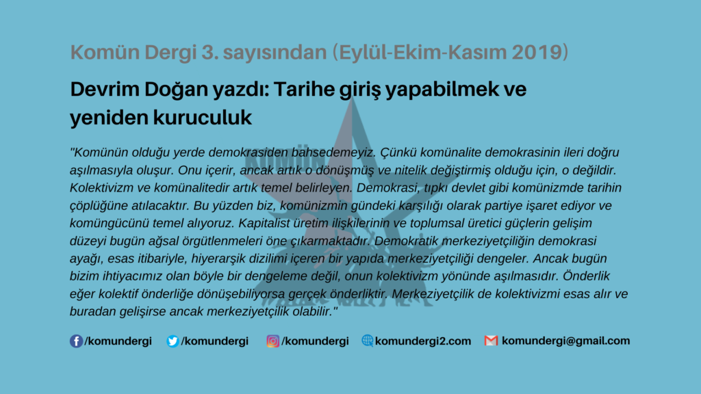 Komünün olduğu yerde demokrasiden bahsedemeyiz. Çünkü komünalite demokrasinin ileri doğru aşılmasıyla oluşur. Onu içerir, ancak artık o dönüşmüş ve nitelik değiştirmiş olduğu için, o değildir. Kolektivizm ve komünalitedir artık temel belirleyen. Demokrasi, tıpkı devlet gibi komünizmde tarihin çöplüğüne atılacaktır. Bu yüzden biz, komünizmin gündeki karşılığı olarak partiye işaret ediyor ve komüngücünü temel alıyoruz. Kapitalist üretim ilişkilerinin ve toplumsal üretici güçlerin gelişim düzeyi bugün ağsal örgütlenmeleri öne çıkarmaktadır. Demokratik merkeziyetçiliğin demokrasi ayağı, esas itibariyle, hiyerarşik dizilimi içeren bir yapıda merkeziyetçiliği dengeler. Ancak bugün bizim ihtiyacımız olan böyle bir dengeleme değil, onun kolektivizm yönünde aşılmasıdır. Önderlik eğer kolektif önderliğe dönüşebiliyorsa gerçek önderliktir. Merkeziyetçilik de kolektivizmi esas alır ve buradan gelişirse ancak merkeziyetçilik olabilir.