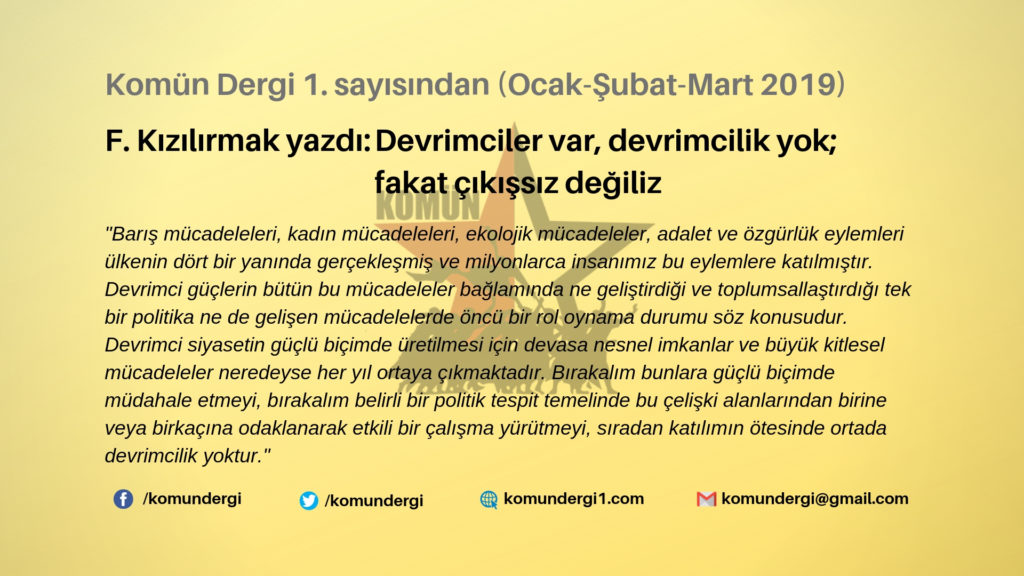 Yine bir kez daha hatırlatmakta fayda var; bu yeni bir durum değildir. Devrimci hareketlerimizin içinden çıktığı 1945-90 arası dönemin devrimciliği Türkiye özgülünde 1995-6’ya gelindiğinde bitmişti. Bugün varılan nokta, geride kalan devrimcilik çabalarının da önemli ölçüde tasfiye olmasıdır.