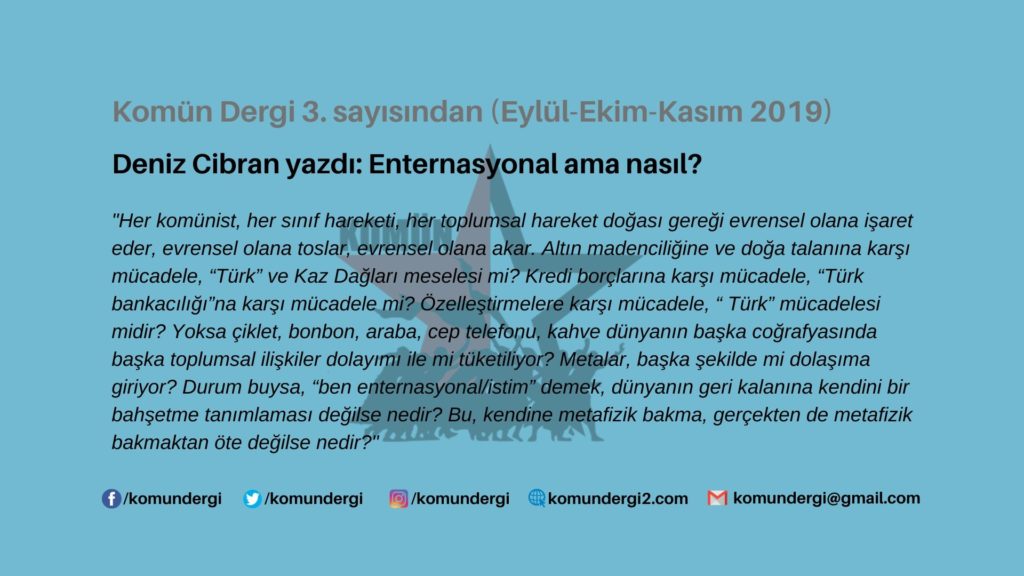 Her komünist, her sınıf hareketi, her toplumsal hareket doğası gereği evrensel olana işaret eder, evrensel olana toslar, evrensel olana akar. Altın madenciliğine ve doğa talanına karşı mücadele, “Türk” ve Kaz Dağları meselesi mi? Kredi borçlarına karşı mücadele, “Türk bankacılığı”na karşı mücadele mi? Özelleştirmelere karşı mücadele, “ Türk” mücadelesi midir? Yoksa çiklet, bonbon, araba, cep telefonu, kahve dünyanın başka coğrafyasında başka toplumsal ilişkiler dolayımı ile mi tüketiliyor? Metalar, başka şekilde mi dolaşıma giriyor? Durum buysa, “ben enternasyonal/istim” demek, dünyanın geri kalanına kendini bir bahşetme tanımlaması değilse nedir? Bu, kendine metafizik bakma, gerçekten de metafizik bakmaktan öte değilse nedir?