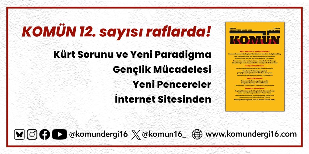 KOMÜN emekçileri olarak, uzun bir aradan sonra Ocak, Şubat ve Mart aylarını kapsayacak olan on ikinci sayımızla okurlarımıza merhaba diyoruz. Bu sayımızın ilk dosyası, “Kürt Sorunu ve Yeni Paradigma” başlığını taşıyor. Bu dosyadaki ilk yazımız, M. Aytunç Altay’ın “Barış ve Demokratik Toplum Manifestosu Üzerine” başlıklı yazısı. Yazarımız bu yazısında ilk olarak, Kürt Özgürlük Hareketi’nin yaşadığı stratejik dönüşümü değerlendiriyor, devamında da bu dönüşümün yaslandığı ve “yeni paradigma” olarak ifade edilen teorik görüşler üzerinde duruyor. Öcalan’ın eski savunmalarıyla beraber yeni paradigma değişikliği olarak sunulan görüşlerini üç ayrı başlıkta ele alan yazarımız; reel sosyalizm eleştirilerinden başlayarak onun tarih anlayışı ve felsefi bakışını irdeliyor, özellikle de komün ve sınıfla ilgili olarak söylediklerini eleştiriyor. Öcalan’ın “demokratik toplum sosyalizmi” olarak adlandırdığı ve kapitalist devletin varlığı altında yaratılacağını söylediği sosyalizm öngörüsünün, üretim araçlarının özel mülkiyeti sona erdirilmeksizin ve siyasi iktidar ele geçirilmeksizin gerçekleşemeyeceğini anlatıyor.