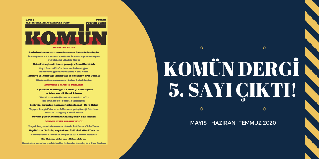 Komün Dergi emekçileri olarak işçi sınıfının ve ezilenlerin mücadele günü olan 1 Mayıs’ı yeni komünler yaratma hedefiyle selamlıyoruz. Dergimizin “Marksizm ve Din”, “Komünar Uyanış ve Derleniş” ile “Corona Virüs Salgını ve Sosyalist Sol” başlıklı dosya konularından oluşan beşinci sayısını, tarihsel günümüz olan 1 Mayıs’ta yayımlıyoruz.