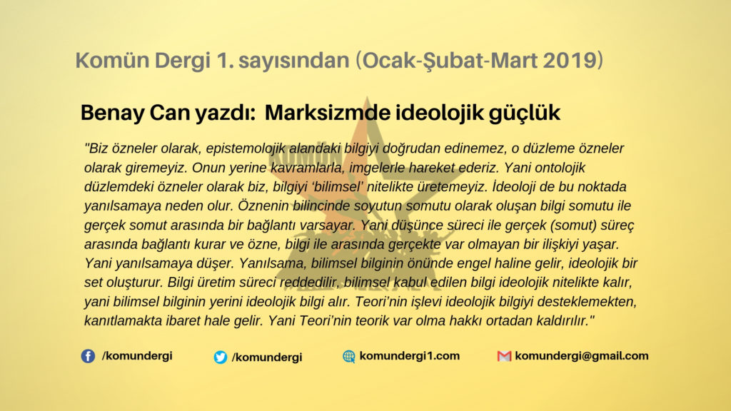 Biz özneler olarak, epistemolojik alandaki bilgiyi doğrudan edinemez, o düzle­me özneler olarak giremeyiz. Onun yerine kavramlarla, imgelerle hareket ederiz. Yani ontolojik düzlemdeki özneler olarak biz, bilgiyi ‘bilimsel’ nitelikte üretemeyiz. İdeoloji de bu noktada yanılsamaya neden olur. Öznenin bilincinde soyutun somu­tu olarak oluşan bilgi somutu ile gerçek somut arasında bir bağlantı varsayar. Yani düşünce süreci ile gerçek (somut) süreç arasında bağlantı kurar ve özne, bilgi ile arasında gerçekte var olmayan bir ilişkiyi yaşar. Yani yanılsamaya düşer. Yanılsama, bilimsel bilginin önünde engel haline gelir, ideolojik bir set oluşturur. Bilgi üretim süreci reddedilir, bilimsel kabul edilen bilgi ideolojik nitelikte kalır, yani bilimsel bilginin yerini ideolojik bilgi alır. Teori’nin işlevi ideolojik bilgiyi desteklemekten, kanıtlamakta ibaret hale gelir. Yani Teori’nin teorik var olma hakkı ortadan kaldırılır.