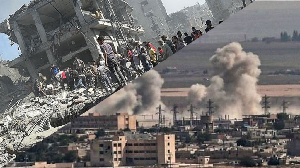 Her iki savaşın baş sorumluları TC ve İsrail neden uluslararası camia tarafından savaşı durduracak kadar güçlü ve gerçek yaptırımlara tabi tutulamıyorlar? 21.yüzyılın siyasi soykırım (Kürtler) ve etnik temizlik (Arap Filistin’i) savaşlarının cereyan ettiği bu coğrafya emperyalizm için o denli varlık yokluk sorunu ki her türlü melanete göz yumuluyor. Her gün İsrail’in Gazze’deki soykırım savaşını eleştiren ülkelerin İsrail ile olan ticaretlerini sürdürmeleri; mesela TC’nin Azerbaycan üzerinden İsrail’e gidecek doğal gaz boru hattı projesini neden iptal etmediği sorgulanmıyor! Rojava ’da kullanılan kimyasal silahlar, radyoaktif içerikli lokal bombalar neden ABD ve Avrupa tarafından sessizlikle geçiştiriliyor? İsrail’in Filistin topraklarında dünyanın gözleri önünde yürüttüğü yerleşimci işgal politikasına yıllardır ses çıkarmayanlar, bunu sessizce onaylayanlar TC’nin Suriye’nin kuzeyindeki irredantizm (ülke sınırları dışında etnik olarak kendi ulusundan olan insanların varlığının zarar gördüğünü iddia ederek sınırdaş ülke topraklarını kendi ülkesine katma isteğiyle ilhak etme girişimi) politikalarını da görmezden geliyorlar. Türkiye devleti Suriye’nin kuzeyinde yaklaşık 1000 den fazla yerleşim birimini kapsayan 10000 kilometrekarelik bir alanı ilhak etmiştir. İsrail ile aralarındaki tek fark TC’nin işgal ettiği Suriye topraklarına kendi halkı olarak gördüğü Türkmenler dışında, devrimci Kürt kuvvetlerine karşı işbirliği yaptığı Selefi ve Arap aşiretlerini de yerleştirmesidir.