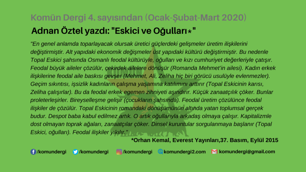 Sonuç: En genel anlamda toparlayacak olursak üretici güçlerdeki gelişmeler üretim ilişkilerini değiştirmiştir. Alt yapıdaki ekonomik değişmeler üst yapıdaki kültürü değiştirmiştir. Bu nedenle Topal Eskici şahsında Osmanlı feodal kültürüyle, oğulları ve kızı cumhuriyet değerleriyle çatışır. Feodal büyük aileler çözülür, çekirdek ailelere dönüşür (Romanda Mehmet’in ailesi). Kadın erkek ilişkilerine feodal aile baskısı gevşer (Mehmet, Ali, Zeliha hiç biri görücü usulüyle evlenmezler). Geçim sıkıntısı, işsizlik kadınların çalışma yaşamına katılımını arttırır (Topal Eskicinin karısı, Zeliha çalışırlar). Bu da feodal erkek egemen zihniyeti aşındırır. Küçük zanaatçılık çöker. Bunlar proleterleşirler. Bireyselleşme gelişir (çocukların şahsında). Feodal üretim çözülünce feodal ilişkiler de çözülür. Topal Eskicinin romandaki dönüşümünün altında yatan toplumsal gerçek budur. Despot baba kabul edilmez artık. O artık oğullarıyla arkadaş olmaya çalışır. Kapitalizmle dost olmayan toprak ağaları, zanaatçılar çöker. Dinsel kuruntular sorgulanmaya başlanır (Topal Eskici, oğulları). Feodal ilişkiler yıkılır.