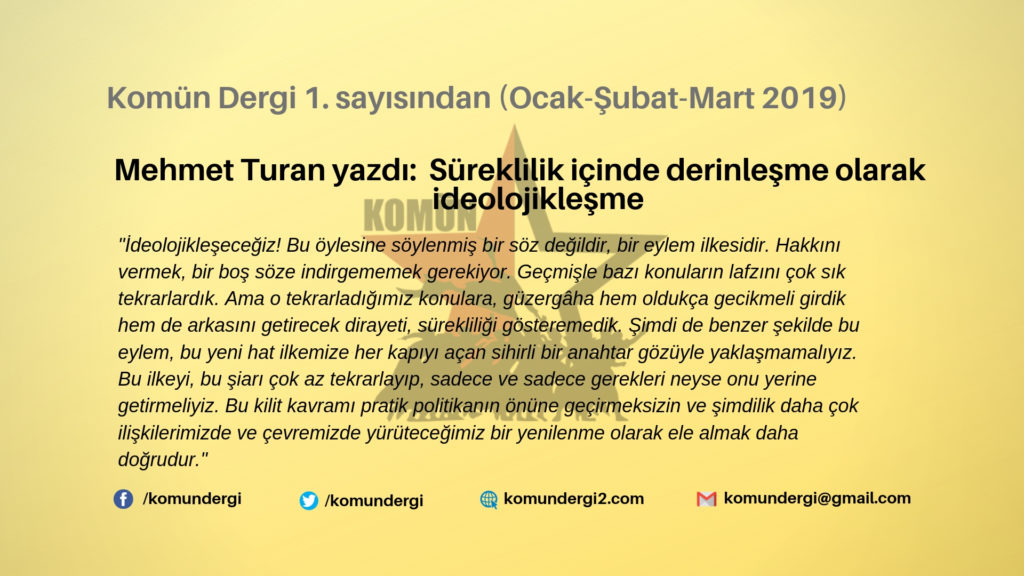 İdeolojikleşeceğiz! Bu öylesine söylenmiş bir söz değildir, bir eylem ilkesidir. Hakkını vermek, bir boş söze indirgememek gerekiyor. Geçmişle bazı konuların lafzını çok sık tekrarlardık. Ama o tekrarladığımız konulara, güzergâha hem oldukça gecikmeli girdik hem de arkasını getirecek dirayeti, sürekliliği gösteremedik. Şimdi de benzer şekilde bu eylem, bu yeni hat ilkemize her kapıyı açan sihirli bir anahtar gözüyle yaklaşmamalıyız. Bu ilkeyi, bu şiarı çok az tekrarlayıp, sadece ve sadece gerekleri neyse onu yerine getirmeliyiz. Bu kilit kavramı pratik politikanın önüne geçirmeksizin ve şimdilik daha çok ilişkilerimizde ve çevremizde yürüteceğimiz bir yenilenme olarak ele almak daha doğrudur. İdeolojikleşeceğiz ama bu şimdilik içsel bir süreç olacak. İdeolojikleşeceğiz ama ne şimdi ne de sonra ideolojiyi politikanın yerine ikame ettirme yanlışına kesinlikle düşmeden yapacağız bunu. Yoksa derneklerde, DKÖ’lerde, üniversite kantinlerinde bolca bulunan, sadece localarından üsten konuşan sol lafazanlardan hiçbir farkımız kalmaz. İdeolojikleşme, kendini yaldızlı sözlerle değil, eylemin muhtevasında, kadrodaki niteliksel dönüşümde gösterecek. Anlamamız gereken temel yön budur ve bu eylem ilkesinde muhtevayı, kadronun ve eylemin muhtevasını zenginleştireceğiz. Söz Bedreddin gibiyken, eylem Börklüce’ninki gibi olacak.